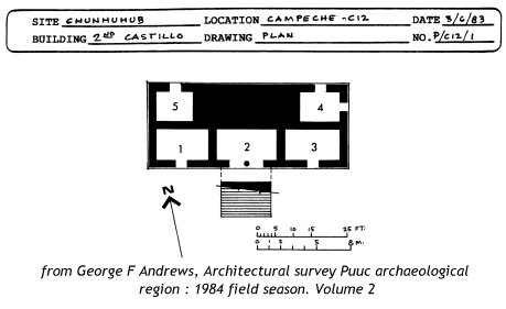 According to Andrews, John Lloyd Stephens was the first to report on Chunhuhub. Later, Teobert Maler reported on the site, describing three “castillos”, the third of which is also known as Xpostanil. Andrews has provided us with some data for both sites, and Maler has provided additional data which might be reconciled with Andrews’ data in order to serve to complement it.