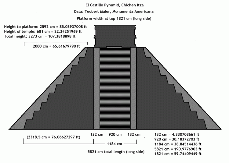 Note that in the diagram for the short side of El Castillo, the stair width is 861 cm = 28.24803150 ft; 1 / 28.24803150 = 354.0069686, so what we are probably looking at these is 1 / 353.9334591 = 28.25389842 ft