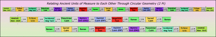 The realization that there was more to the whole number based series than the units using Pi^1 (the Egyptian Royal Cubit) through Pi^5 (the “Alternate e’ Megalithic Yard” or AEMY of 2.720174976, still apparently the primary Megalithic Yard value) came about when I was working on a very first draft of a table illustrating some of what is indicated at upper right in the chart, of how unit values can be generated by multiplication and division of other units.